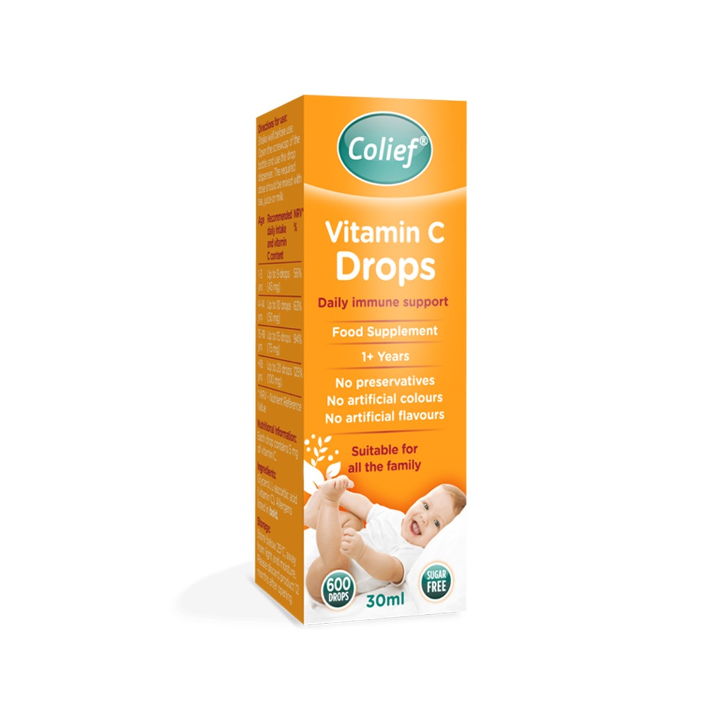 Përforcim ditor i imunitetit. Kur bëhet fjalë për mbështetjen e shëndetit të përgjithshëm të fëmijëve të vegjël, vitamina C luan një rol të rëndësishëm. Kjo është arsyeja pse Colief ka krijuar Colief Vitamin C Drops, për t’ju ndihmuar të mbështesni mirëqenien e fëmijës suaj në vitet e hershme. Përveç mbështetjes së sistemit imunitar dhe përthithjes së hekurit, Vitamina C gjithashtu ndihmon në prodhimin e kolagjenit, i cili është i nevojshëm për formimin e enëve të gjakut, kockave, kërcit, mishrave të dhëmbëve, lëkurës dhe dhëmbëve. Të gjitha të rëndësishme për zhvillimin e fëmijëve të vegjël. I përshtatshëm për të gjithë familjen, Colief Vitamin C Drops është një suplement ushqimor i pasur me vitaminë C dhe pa maja, gluten, misër, niseshte, grurë, arra, soje dhe bulmet. E shtuar lehtësisht në qumësht ose lëng, mund të merret nga fëmijët e moshës një vjeç e lart. Colief Vitamina C Drops është një suplement ditor i përshtatshëm, pa sheqer dhe prodhohet pa shije, ngjyra ose konservues artificialë. Udhëzime mbi përdorimin Hidhni disa pika Colief Vitamin C Drops në çaj, lëngje ose qumësht njëlloj siç janë përcaktuar në tabelën e mëposhtme:
