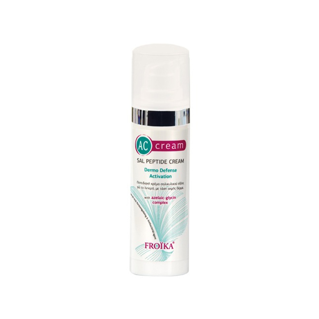 Froika Ac Sal Peptide Cream Krem peptid me acid salicilik i cili aktivizon mbrojtjen e dermës,i përshtatshëm për lëkurë të yndyrshme dhe akneike të prirur ndaj njollave. Hidraton lëkurën dhe lë një ndjesi mat, jo të yndyrshme. Përthithet shpejt duke dhënë një ndjesi të këndshme lehtësimi dhe freskie. Vepron kundër papërsosmërive estetike duke lënë një lëkurë të lëmuar, me shkëlqim mat, me ngjyrë uniforme dhe pa yndyrë, apo skuqje. Largon njollat akneike të lëkurës, poret e zmadhuara me shkëlqimin e dukshëm, inflamacionet, skuqjet dhe çngjyrosjet në lëkurë. Shmang thatësinë, intolerancën dhe acarimet e trajtimeve farmaceutike kundër akneve. Udhëzime mbi përdorimin Aplikojeni kremin dy herë në ditë pas pastrimit të lëkurës me AC Sal-Wash ose AC Losion F. Aplikojeni kremin në mënyrë të barabartë në të gjithë fytyrën, duke insistuar më shumë në çdo zonë problematike të saj, duke shmangur zonën rreth syve dhe gojës. Është i përshtatshëm për t’u përdorur edhe me trajtime të tjera kundër akneve pasi rrit përfitimet në lëkurë, vepron kundër thatësisë që mund të shkaktohet prej tyre dhe rrit tolerancën e lëkurës.